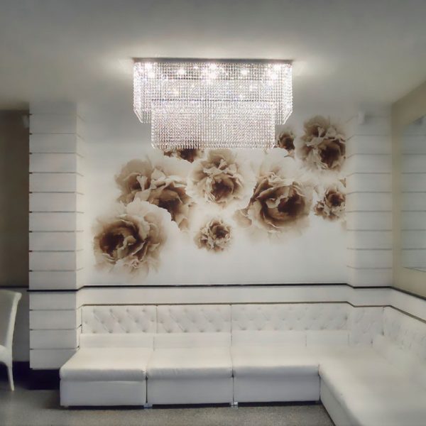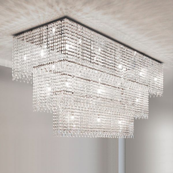 Rectangular shaped ceiling lamp characterized by a cascade of crystals. The structure is made of polished chrome metal with transparent crystals of 30% PbO. It can deliver a refined brightness to the living room or the dining area.