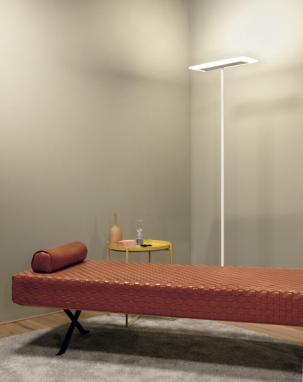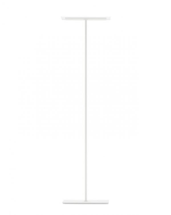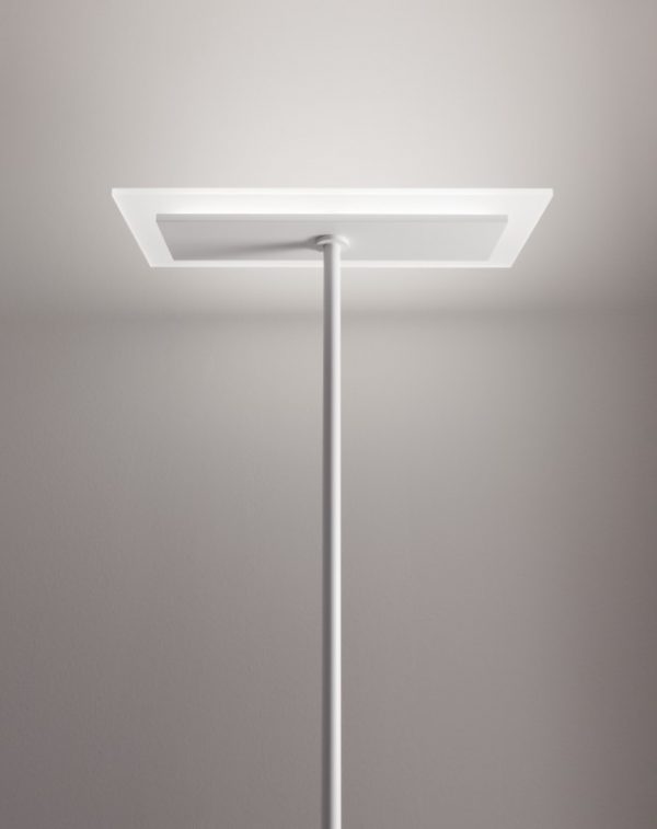 A minimal shaped floor lamp in contemporary design. The diffuser is satin-finished PMMA which is perfectly symmetrical with the base, rising up thanks to the straight and solid shaft in white coated metal. A very stylish and elegant floor light that furnishes the areas of private homes and hotels, offering diffused lighting for a warm and welcoming atmosphere.