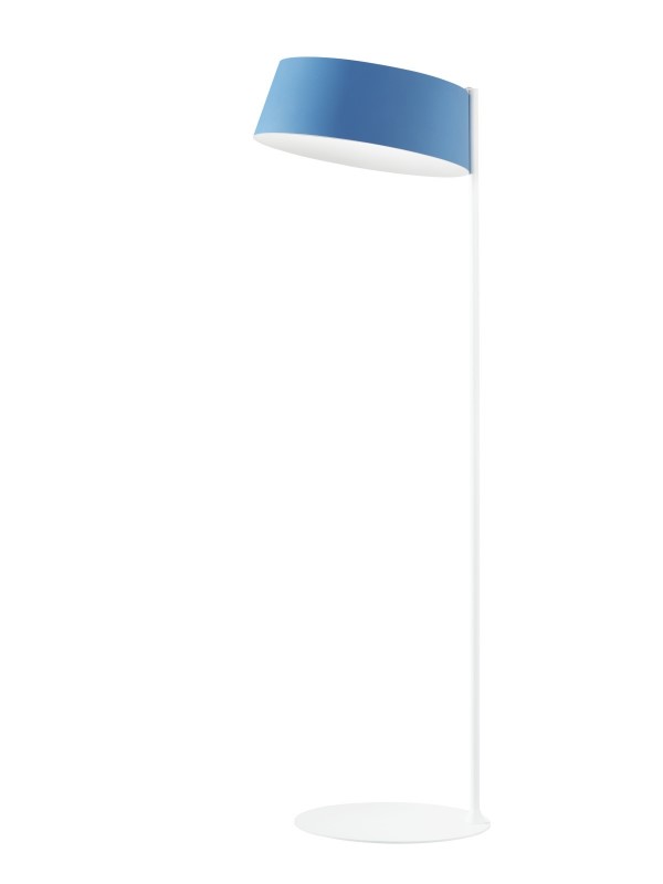 A straight upright reading light is formed in a white-finished steel frame. The polyurethane lampshades are available in elegant finishes (white or black) or in bright colours (yellow and pastel blue). Internally, the white colour remains unchanged to better reflect the light conveyed by the PMMA diffuser.