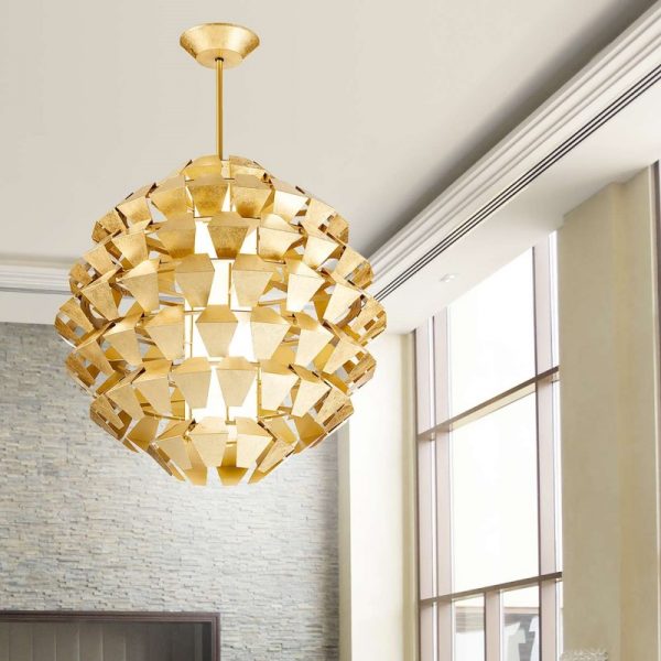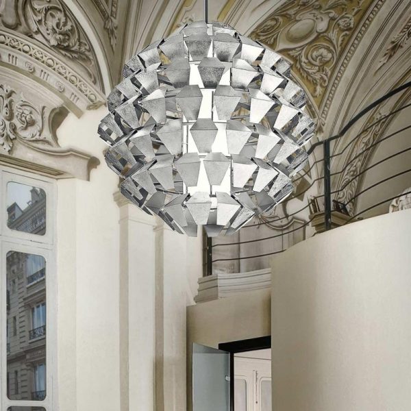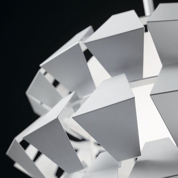 A contemporary suspension lamp hanging from the ceiling like an exotic fruit. It is formed of painted metal pieces. The light source is located within the central opal glass diffuser.