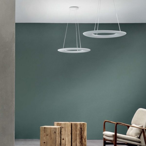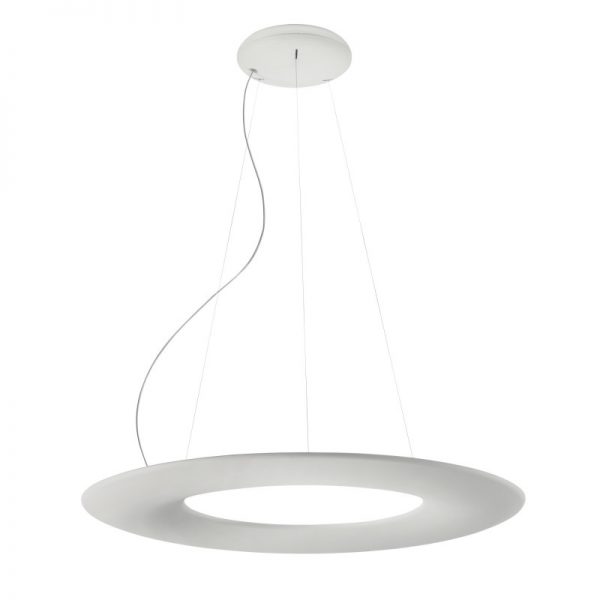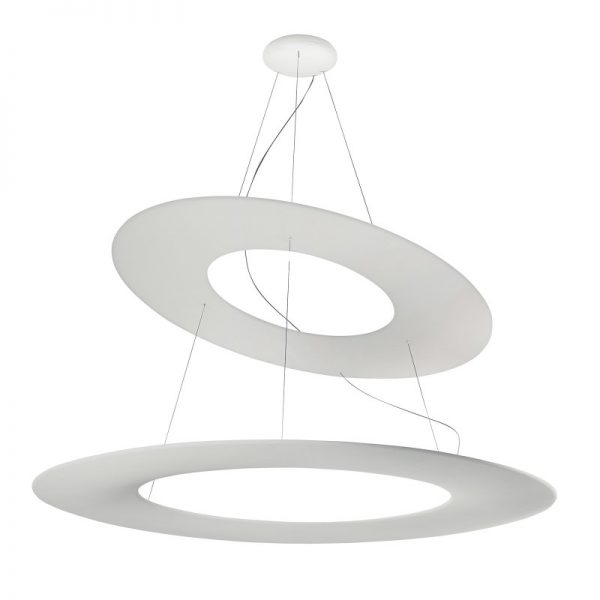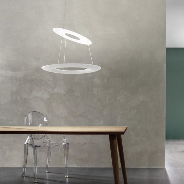 Indirect LED suspension lamp formed by an orbital casing only two centimetres thick, reflections in white that bring refinement and elegance to any environment. Kyklos P1 is a ring-shaped suspension light available in matte white while Kyklos P2 has a second reflective upper ring, which transforms the light into a double emission source.