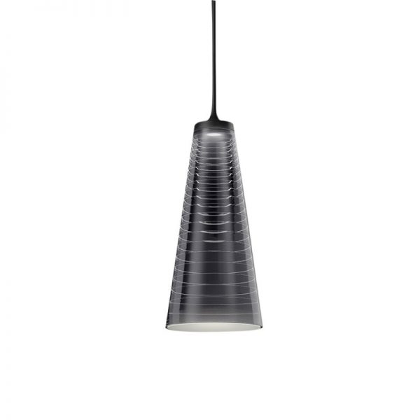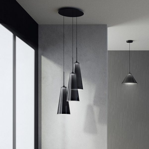 Cone shaped LED pendant light with a transparent black diffuser. The engraved circular patterns create a special lighting effect. The family consists of single, cluster and track mounted suspensions.