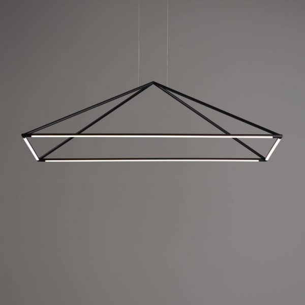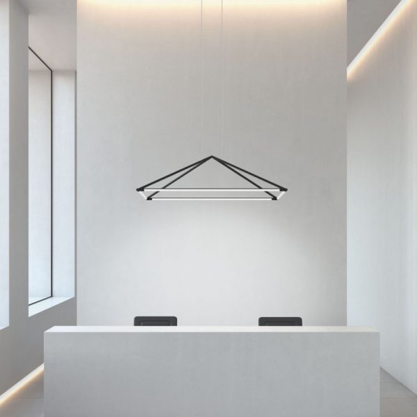 Rectangular LED pendant light. The unique geometry of its pyramid-shaped lines provides soft but powerful lighting for large interiors.