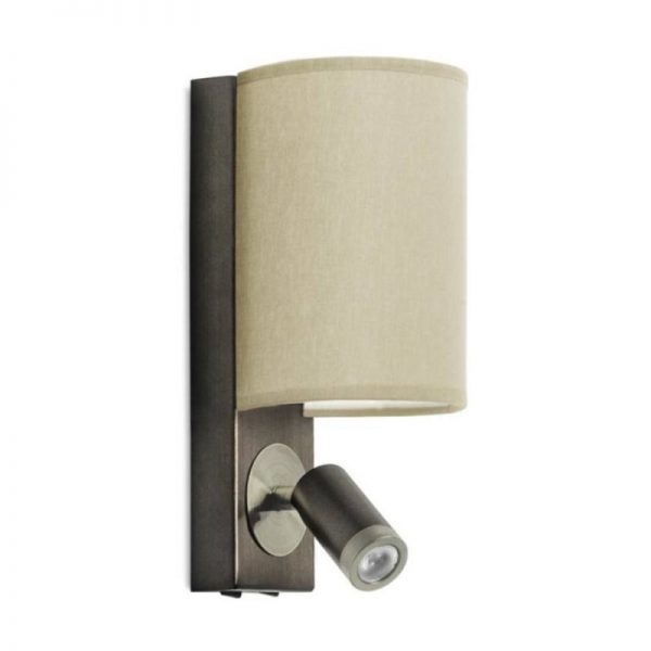 Wall light with reader light in bronze finish with cylindrical lamp shade. Uses two individual LED lights (incl) for general light source and for reading. Equipped with two separate ON/OFF switches.